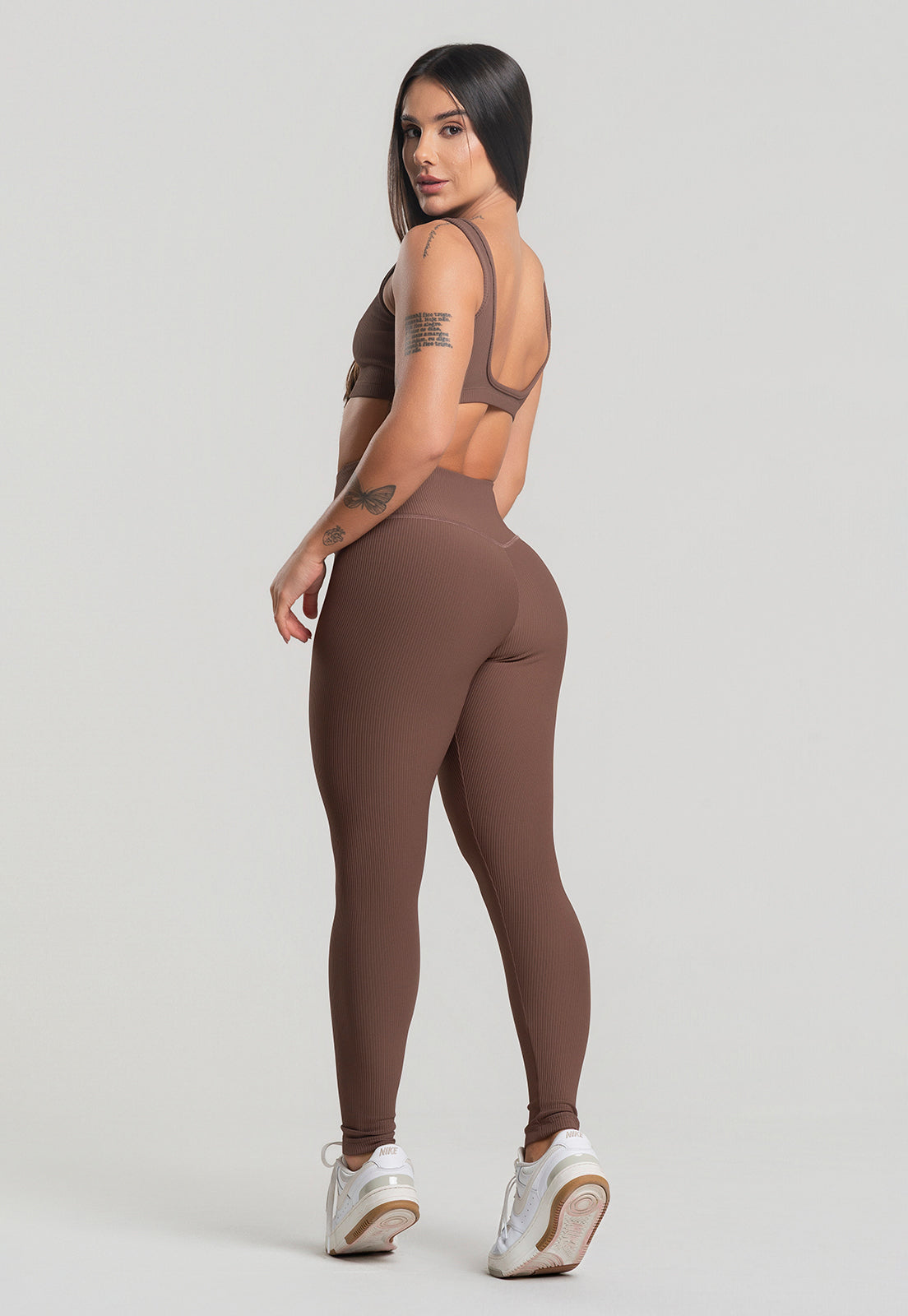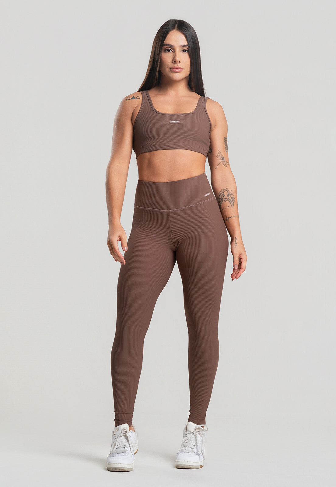 - Cintura alta que garante compressão firme e segurança nos treinos.