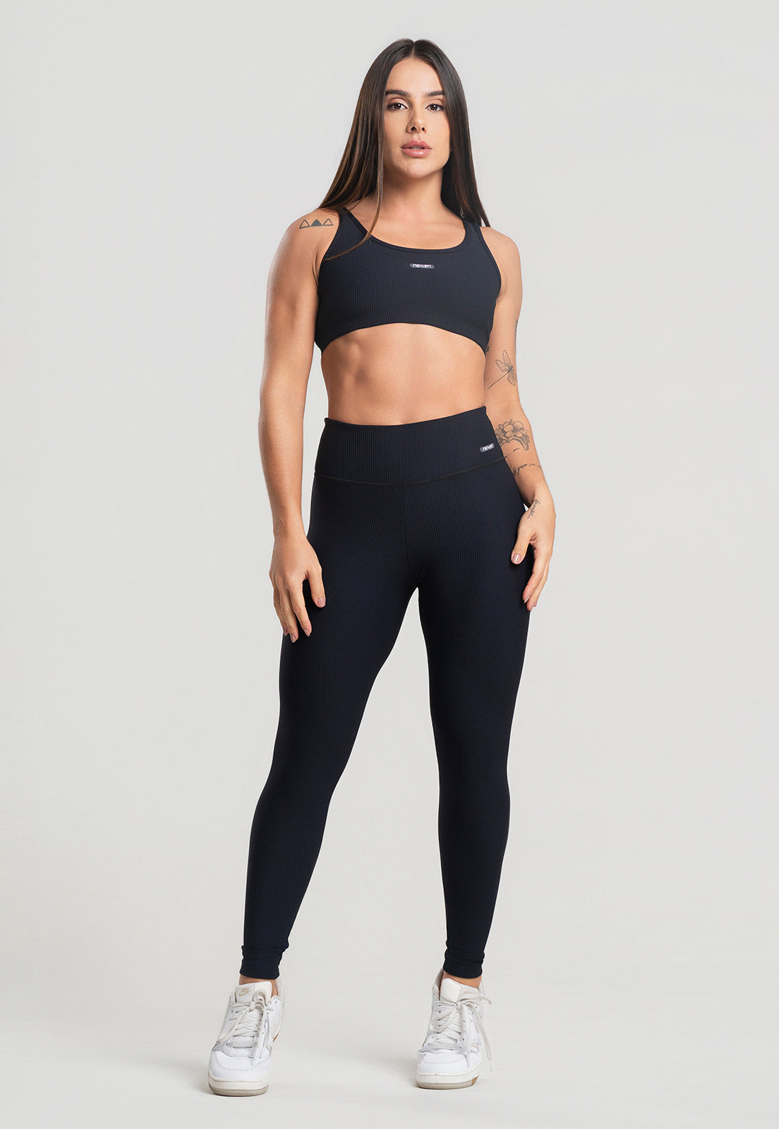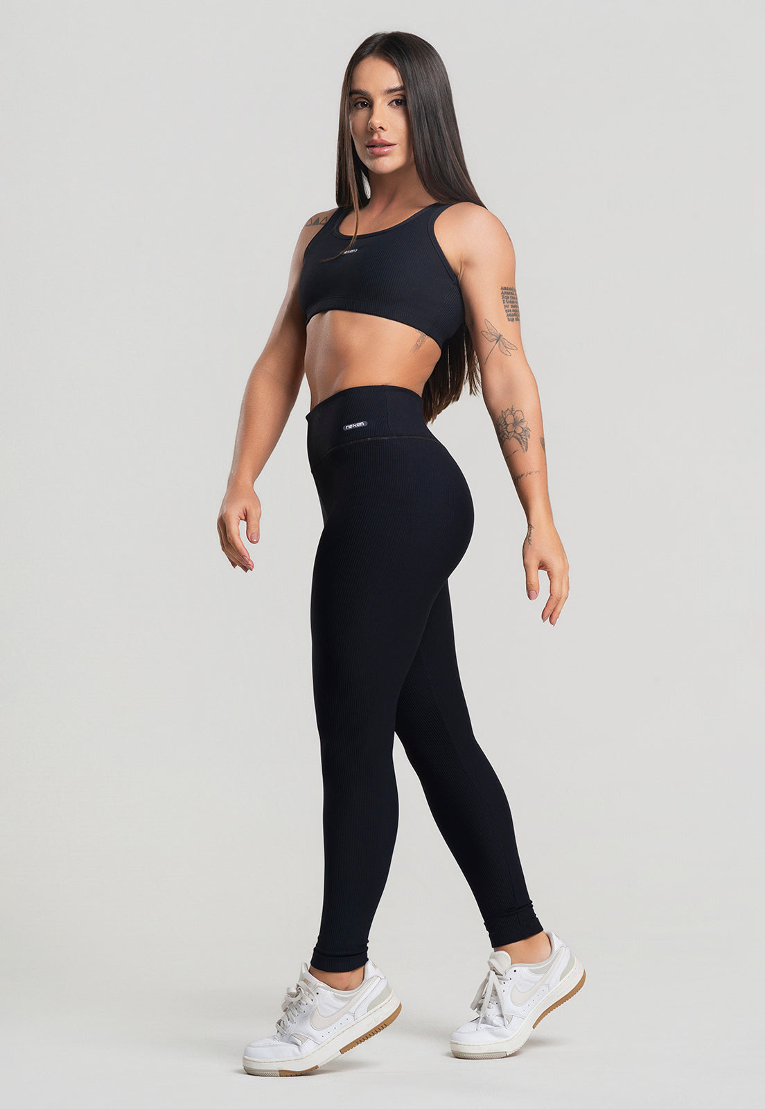 - Cintura alta que garante compressão firme e segurança nos treinos.